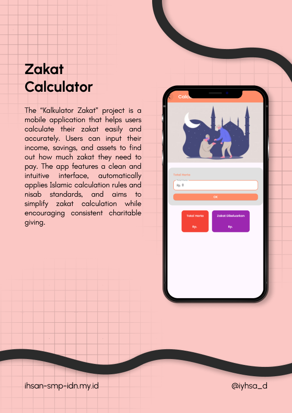 The “Kalkulator Zakat” project is a mobile application that helps users calculate their zakat easily and accurately. Users can input their income, savings, and assets to find out how much zakat they need to pay. The app features a clean and intuitive interface, automatically applies Islamic calculation rules and nisab standards, and aims to simplify zakat calculation while encouraging consistent charitable giving.